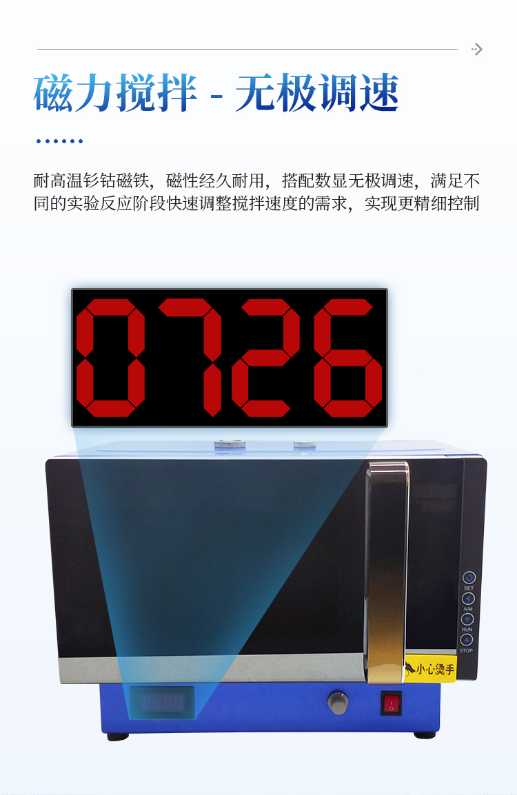 微波反应腔体底部,配备磁力搅拌,采用耐高温钐钴磁铁,最大工作温度可达350℃,长期使用不失磁,无级调速,转速数字显示。