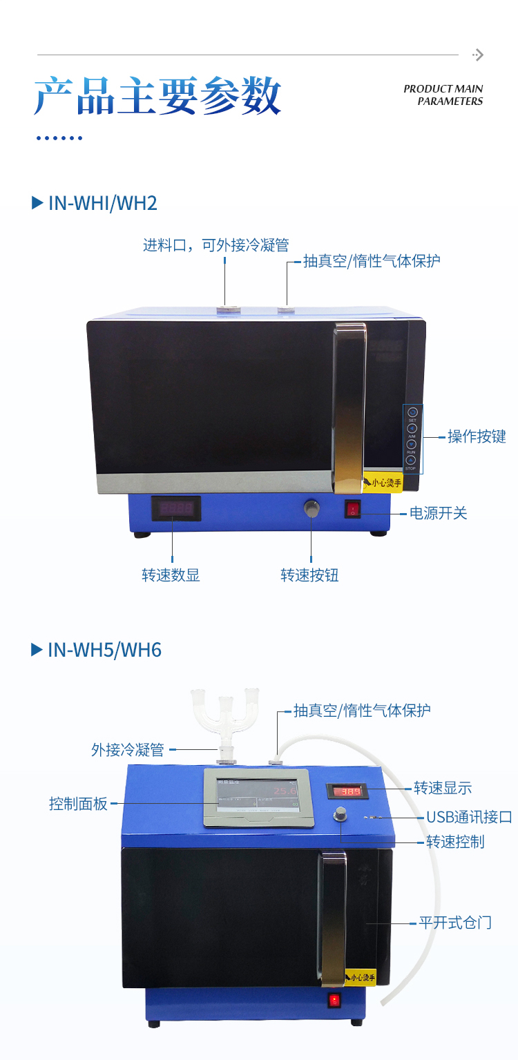 用户可根据反应条件任意加装标准口的反应容器(容积100-500ml)及冷凝回流,滴加,补液和分水等装置 ,同时配备保护性气体加入口。
