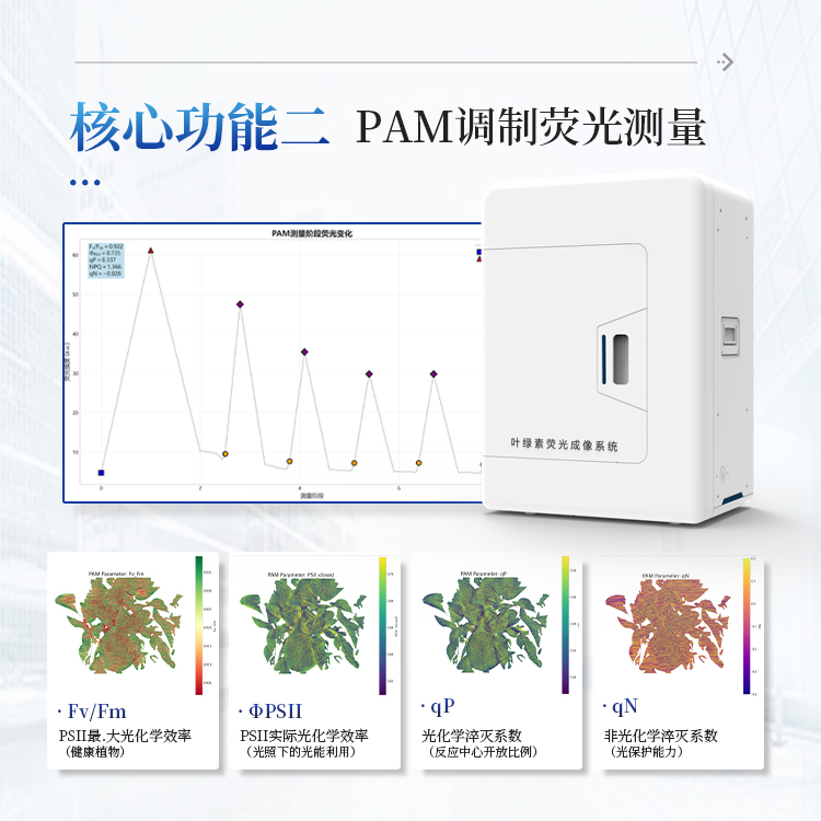 简要描述: 叶绿素荧光成像仪是一款专业的植物光合作用研究仪器,采用高灵敏度CMOS相机和LED光源控制,实现对植物叶片叶绿素荧光的快速、无损检测与成像分析。系统集成了OJIP快速荧光动力学测量和PAM调制荧光测量两大核心功能,能够全面评估植物光合系统的活性、光能利用效率以及环境胁迫响应。