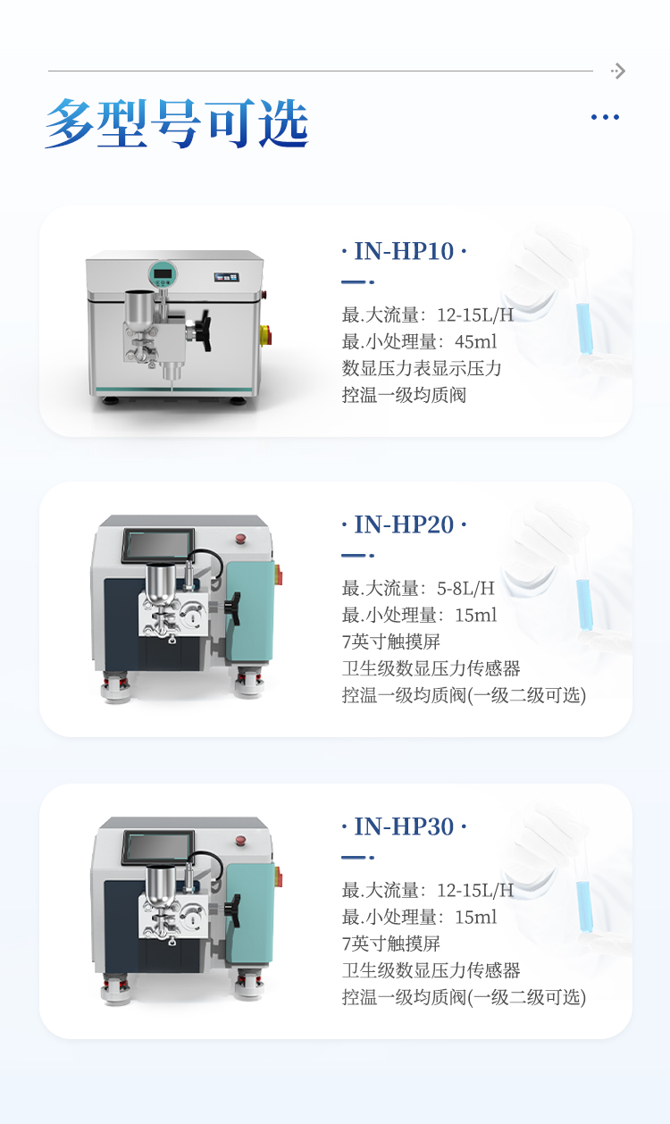 简要描述: 实验室纳米均质仪进料物料粘度:≤2000 cp,最大进料颗粒尺寸 ≤100 μm,物料温度 ≤ 90℃。进料模式:Tri-Clamp快速连接带自吸料设计,无须额外加泵吸料,避免污染及料斗搭配。高压密封采用进口材料,疲劳强度高,耐磨损。使密封长期高压运行保持状态良好。动力源要求:ABB电机泵驱动,电源:220 V/50 Hz。