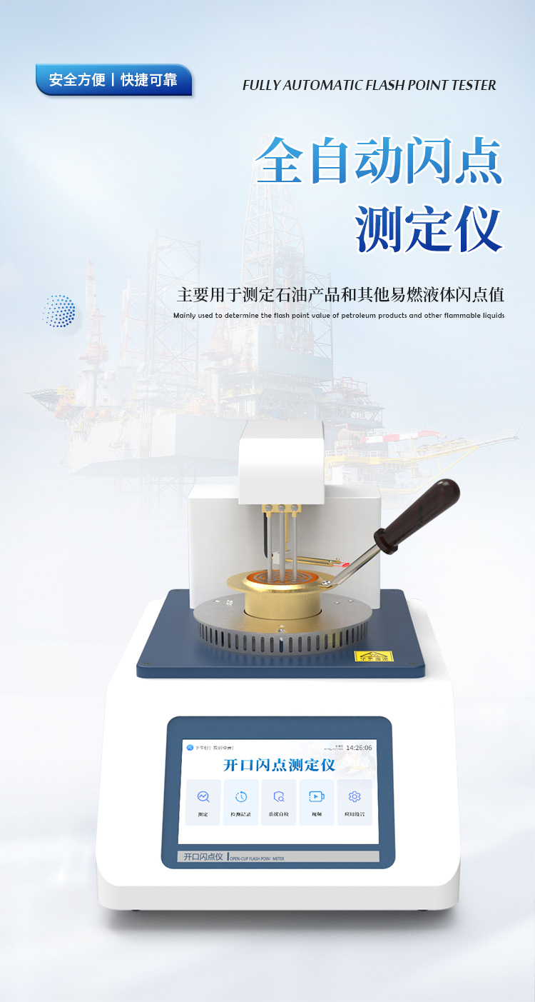 闭口闪点全自动测定仪,主要用于石油产品闭口闪点值的测定,仪器采用ARM微处理器技术、7寸彩色触摸屏技术、中文菜单,人机交互更方便;仪器具有掉电存储功能;仪器具有自动点火、显示、锁定并打印结果、自动冷却等功能;仪器具有测量准确、重复性好、性能稳定可靠,操作简单的优点。广泛应用于电力、石油、化工、商检、科研等部门,符合ASTM D93 、GB/T 261-2008标准方法要求。