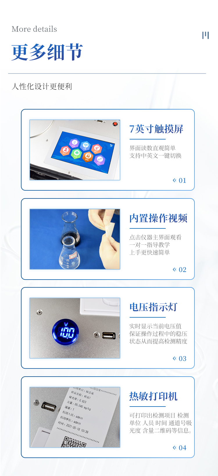 15.样品前处理实验操作步骤全部内置,检测人员无需对照说明书,可以根据仪器提示一步步操作、更适用于新手操作。在检测步骤种内置校准功能,无需手动校准或者开关机校准,确保检测精度。