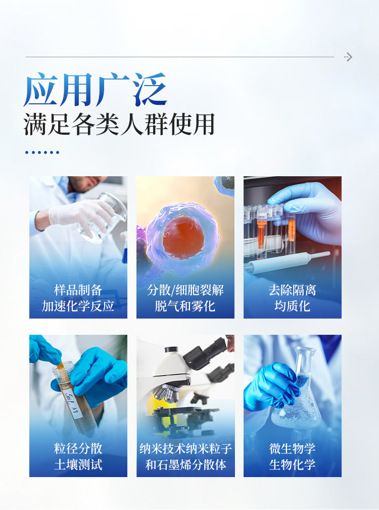超声波破碎仪能用于粉碎动、植物细胞、细菌、牙孢或组织。分散稀土和各类无机矿物粉。