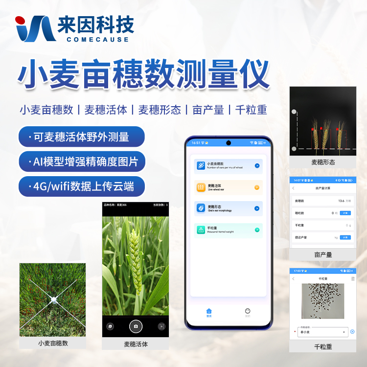 小麦亩穗数测量主要用于快速、准确地测量单位面积内的小麦穗数。该设备结合图像识别技术、人工智能算法与高分辨率摄像系统,通过对实地拍摄的小麦图像进行分析,自动识别并计数麦穗数量,极大地提高了测量效率与准确性。