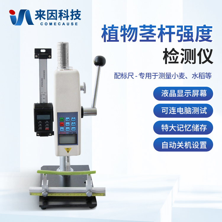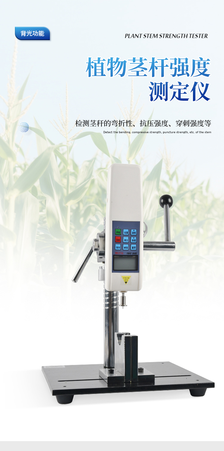 植物茎秆的强度是决定作物抗倒伏能力的一个主要因素,长期以来玉米,高梁、烟草等的倒伏给作物的机械收割造成很大的困难。从机械化水平来说,造成大量的粮食浪费。另外,作物倒伏导致光照不充分,使其生产量受到极大的限制。在作物生长的各个阶段对其茎秆进行活体测量,进而根据茎杆纤维层的抗弯阻力与抗倒伏能力的相关性对群体测量数据进行统计处理,对作物的栽培和育种具有重要意义。植物茎秆强度仪采用拉压力传感器,通过针刺、压碎、折断的方式测出茎秆断裂或者屈服瞬间产生的最大力,即茎秆的强度