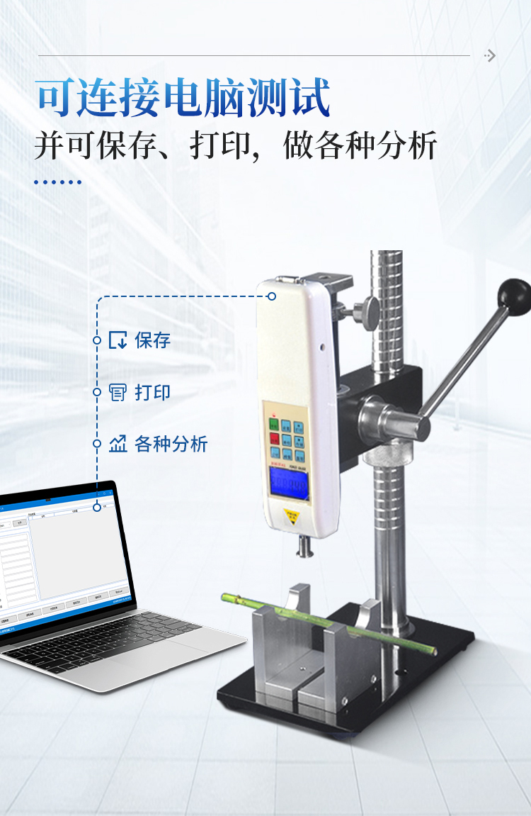 3、可连接电脑测试,可保存、打印,做各种分析,输入速度、面积还可显示位移、压强等参数;