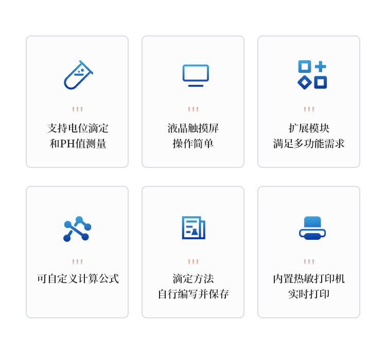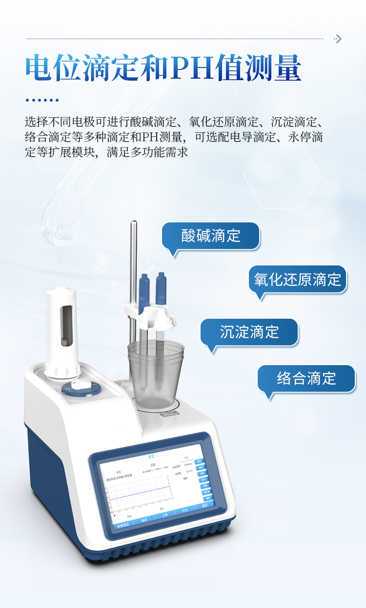 1、设备支持电位滴定和pH值测量;用户选择不同电极可进行酸碱滴定、氧化还原滴定、沉淀滴定、络合滴定等多种滴定和pH测量;