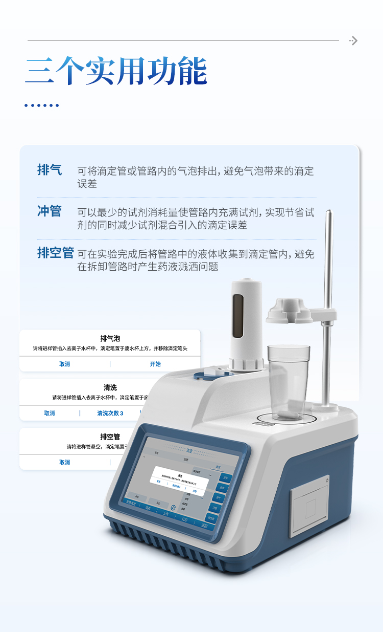 (2)冲管,可以最少的试剂消耗量使管路内充满试剂,实现节省试剂的同时减少试剂混合引入的滴定误差;