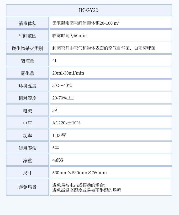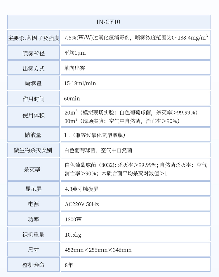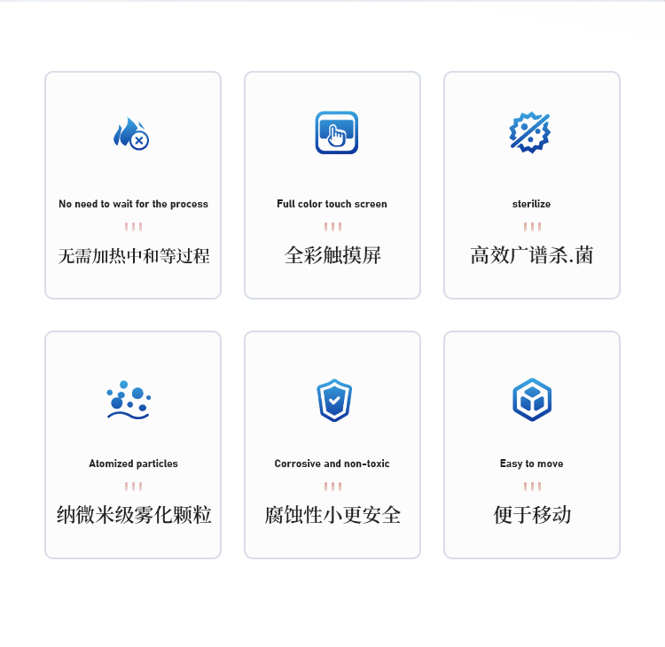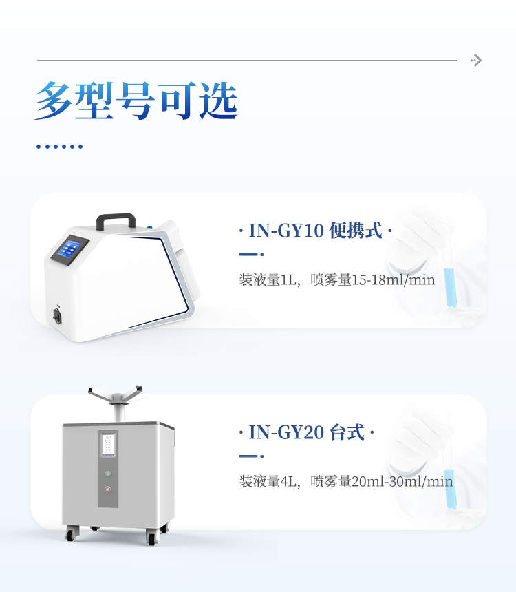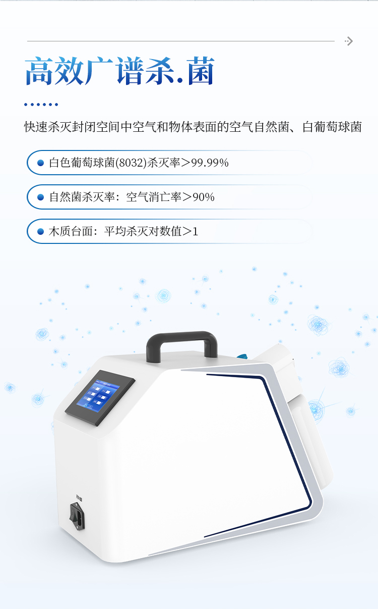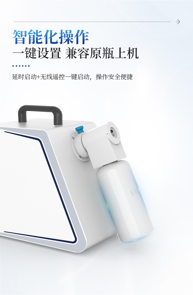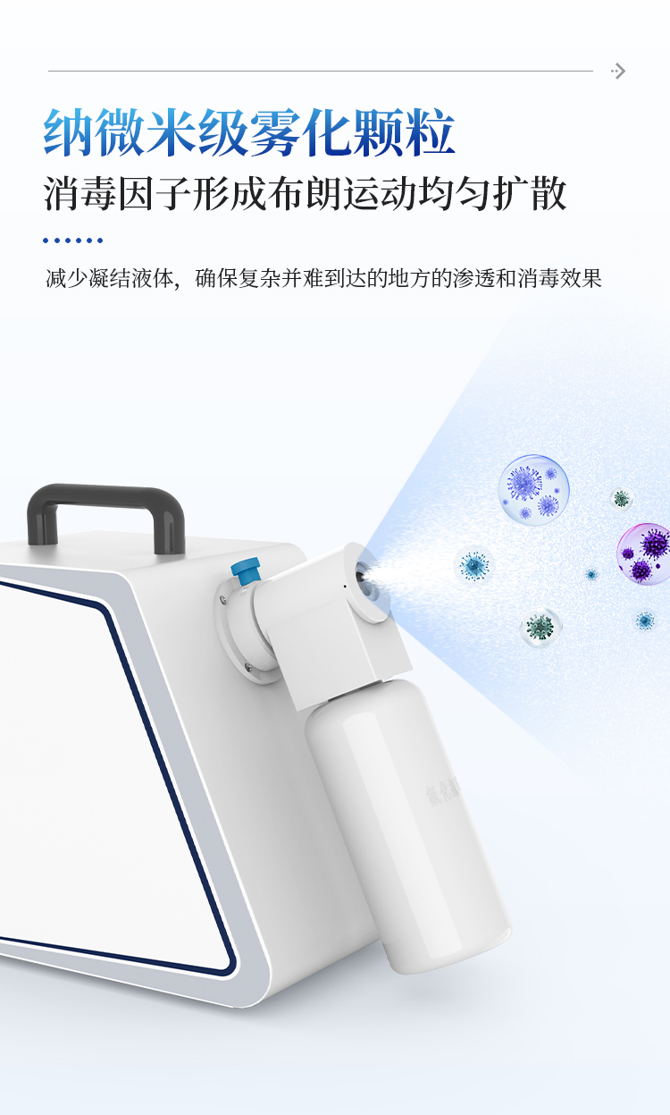 消毒体积和时间范围:无阻碍密闭空间消毒体积20-100 m3;喷雾时间为60min