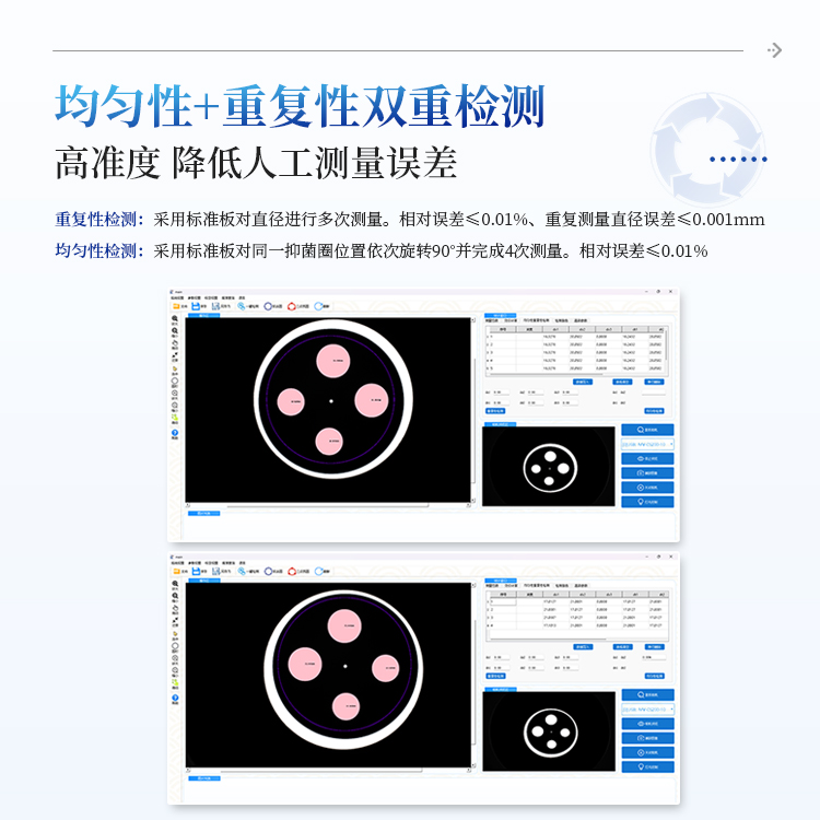 均匀性检测:采用标准板对同一抑菌圈位置依次旋转90°并完成4次测量。相对误差≤0.01%
