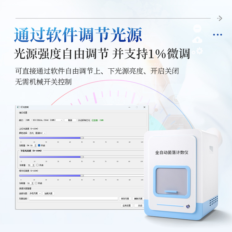 该系列全自动菌落计数及抑菌圈测量仪配备了灵活的上、下双光源系统,用户可以根据培养皿类型、菌落及抑菌圈特性、背景情况,通过软件自由调节光源以获得最佳的成像效果。具体功能包括: