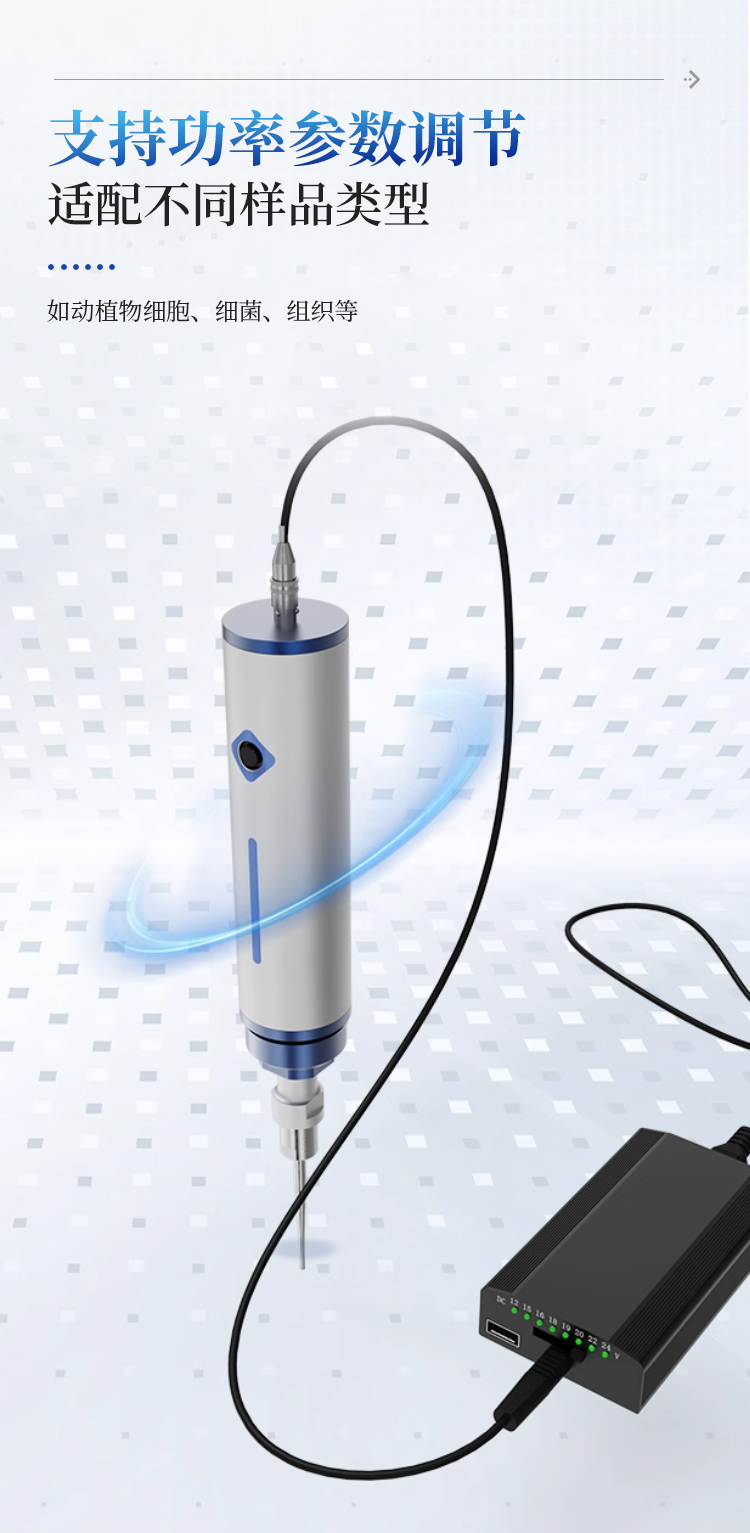 手持超声波细胞破碎仪是一种便携式、高精度的超声波处理设备,适用于实验室小规模样品破碎、乳化、分散和提取等操作。其一体化设计集成了超声波发生器和换能器,操作灵活,可手持使用或搭配支架固定,适用于生物、化学、材料等领域的高效样品处理。
