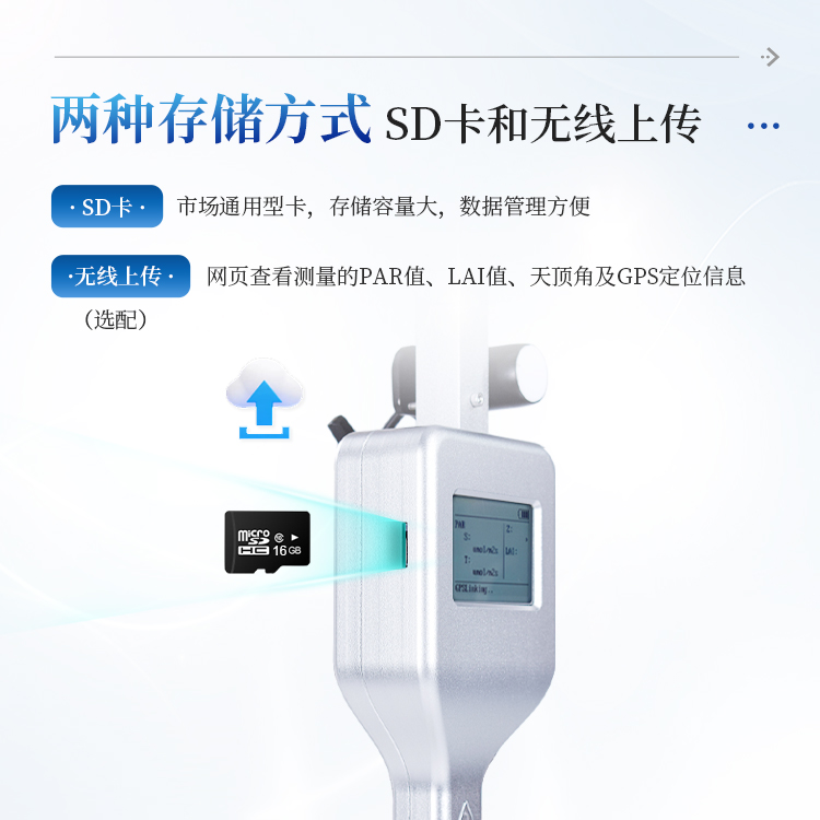 手持冠层分析仪为一体化设计,包括液晶显示屏、操作按键、存储SD卡、探杆传感器、外部传感器等。仪器菜单操作简单,体积小,携带方便。数据保存有SD卡和无线上传(选配)两种存储方式,SD卡为市场通用型卡,存储容量大,数据管理方便;无线上传联网速度快,网页可清晰查看测量的PAR值、LAI值、天顶角及GPS定位信息。功耗有合理的电源管理方案,测试过程中仪器根据实际情况自动进入待机状态,需要时按唤醒键即可唤醒屏幕,观察实际数据。测量方式分为自动和手动两种,自动测量时间间隔最小1分钟,最大60分钟,自动测量次数最大999次;手动测量根据实际需要手动采集即可。