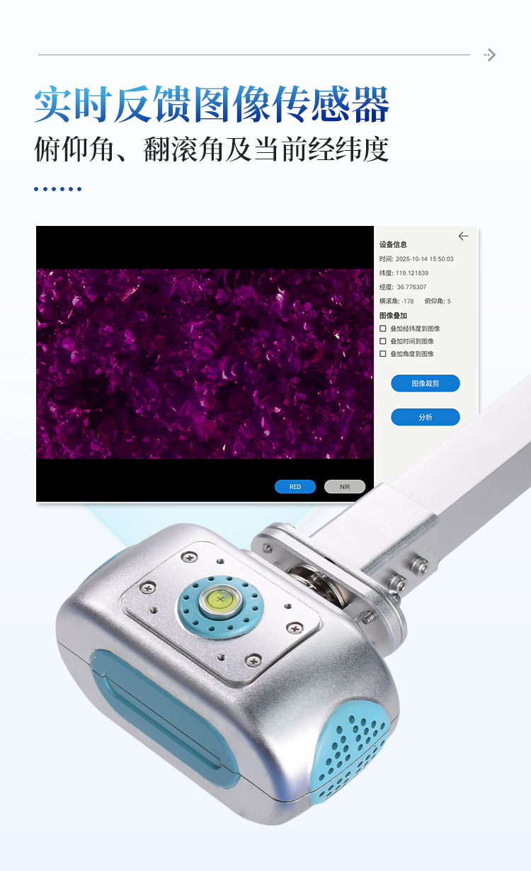 简要描述: 多光谱NDVI检测仪器主要用于草地、农田、湿地、林地等野外数据采样调查,使用方便快捷,精准获取高分辨率的RGB影像以及红光光谱、近红外光谱影像数据,自动计算植被覆盖度FVC,NDVI,LAI冠层等植被指数;可实时反馈图像传感器的俯仰角、翻滚角和方位角,当前经纬度。