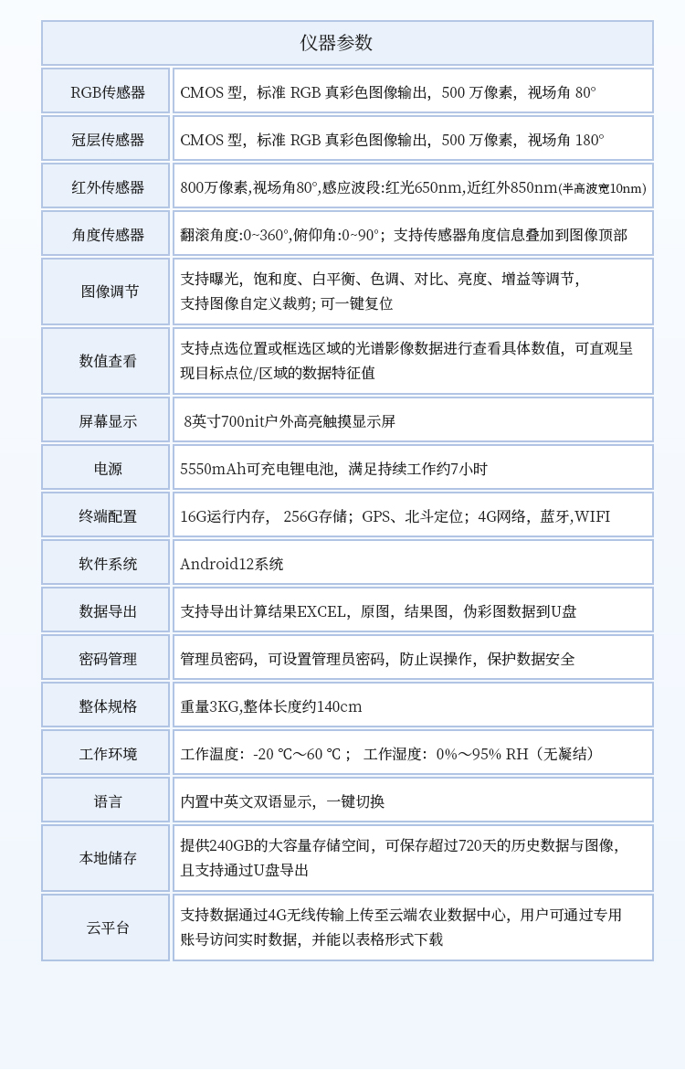 2. 冠层传感器: CMOS 型,标准 RGB 真彩色图像输出,500 万像素,视场角 180°
